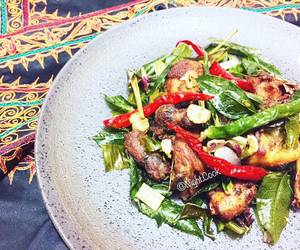 Jamur akan menjadi lembap kembali dengan cepat dengan direndam dalam air dan cairan rendaman memiliki rasa yang kaya dan bisa digunakan untuk berbagai resep masakan. Jamur Tiram Putih Bawang Putih Iris Bawang Merah Iris Lengkuas Geprek Ladaku Cabai Merah Kriting Iris Daun Bawang Tomat Saya skip karna tomat di dapur habis. 3 sendok makan minyak untuk menumis.